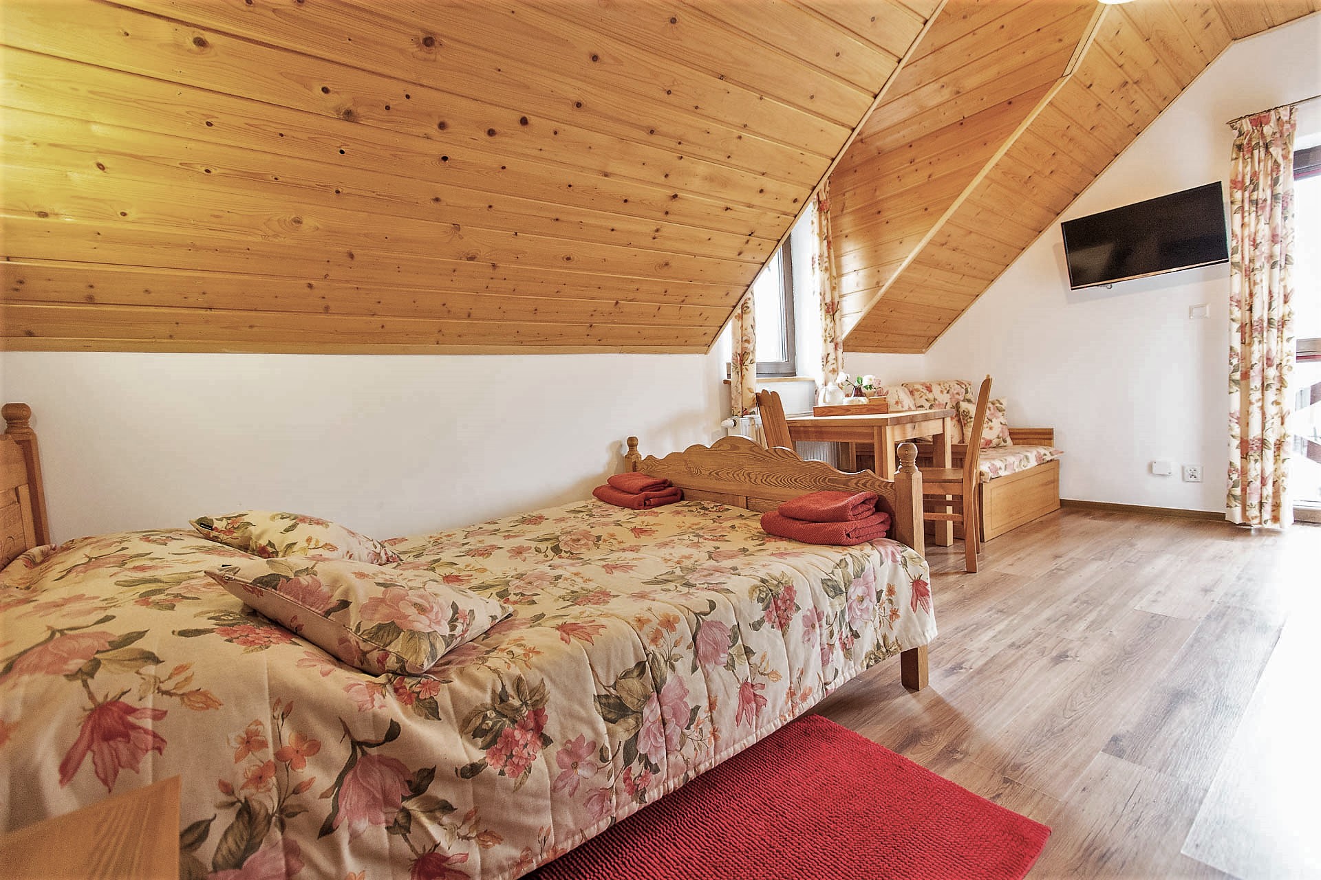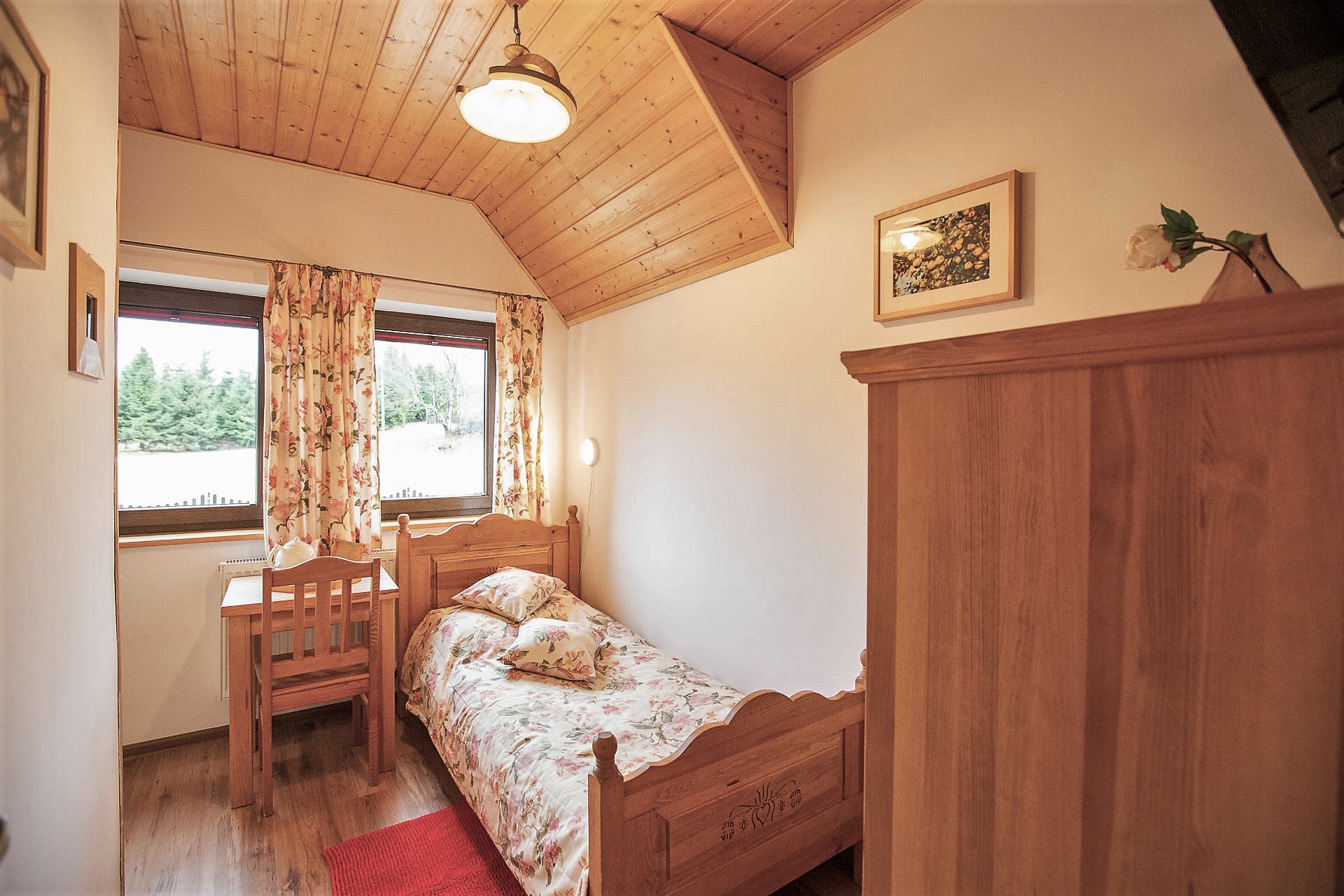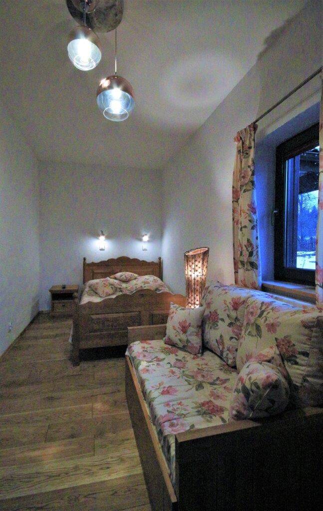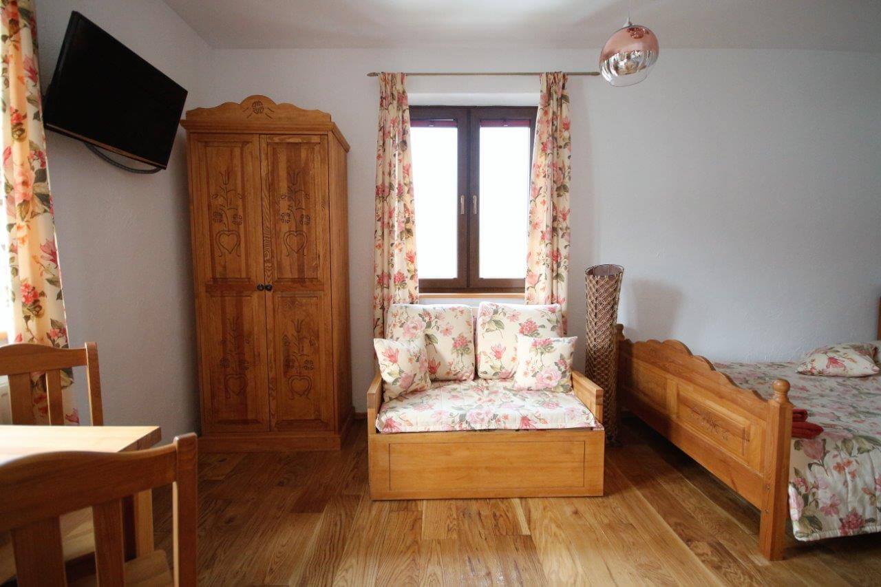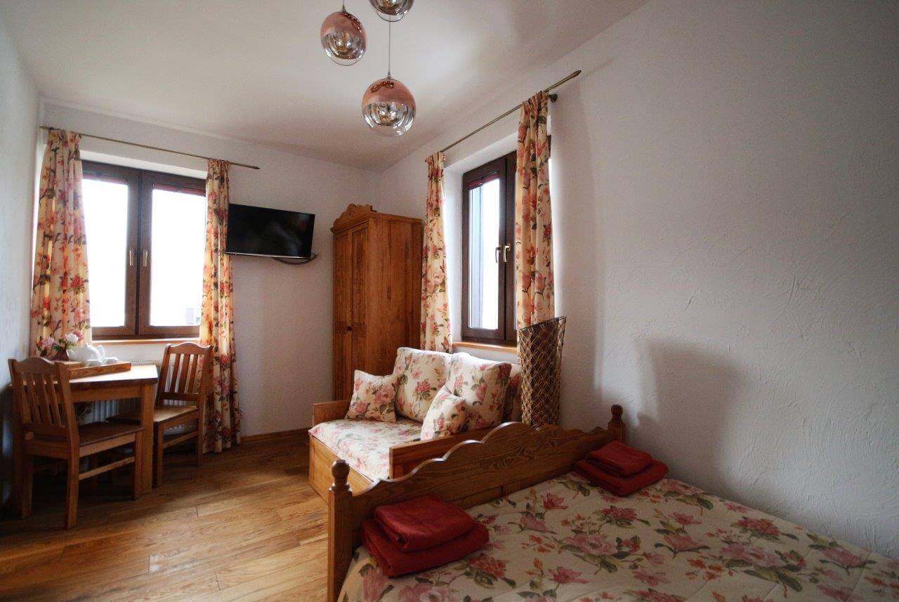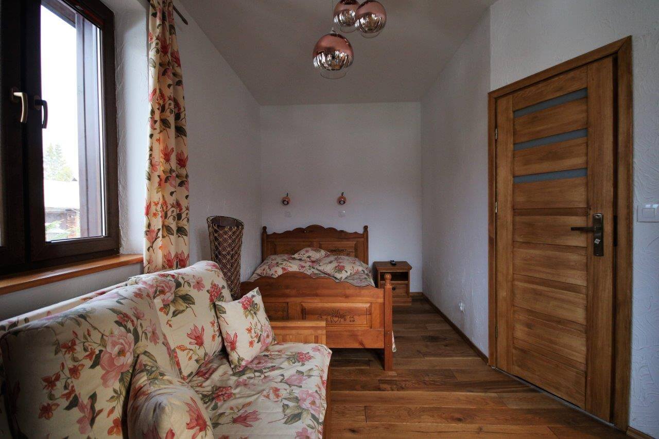W Domu Gościnnym jednorazowo możemy gościć 20 osób w trzech segmentach z osobnymi wejściami. Proponujemy jeden pokój 1-osobowy, 2 pokoje 2-osobowe oraz 5 pokoi 3-osobowych z urokliwym widokiem na górski krajobraz. Istnieje możliwość wynajmu poszczególnych pokoi, segmentów lub całego Pensjonatu. Wszystkie pokoje posiadają łazienki, są wyposażone w telewizor z płaskim ekranem, czajnik elektryczny z zapasem kawy oraz herbaty.