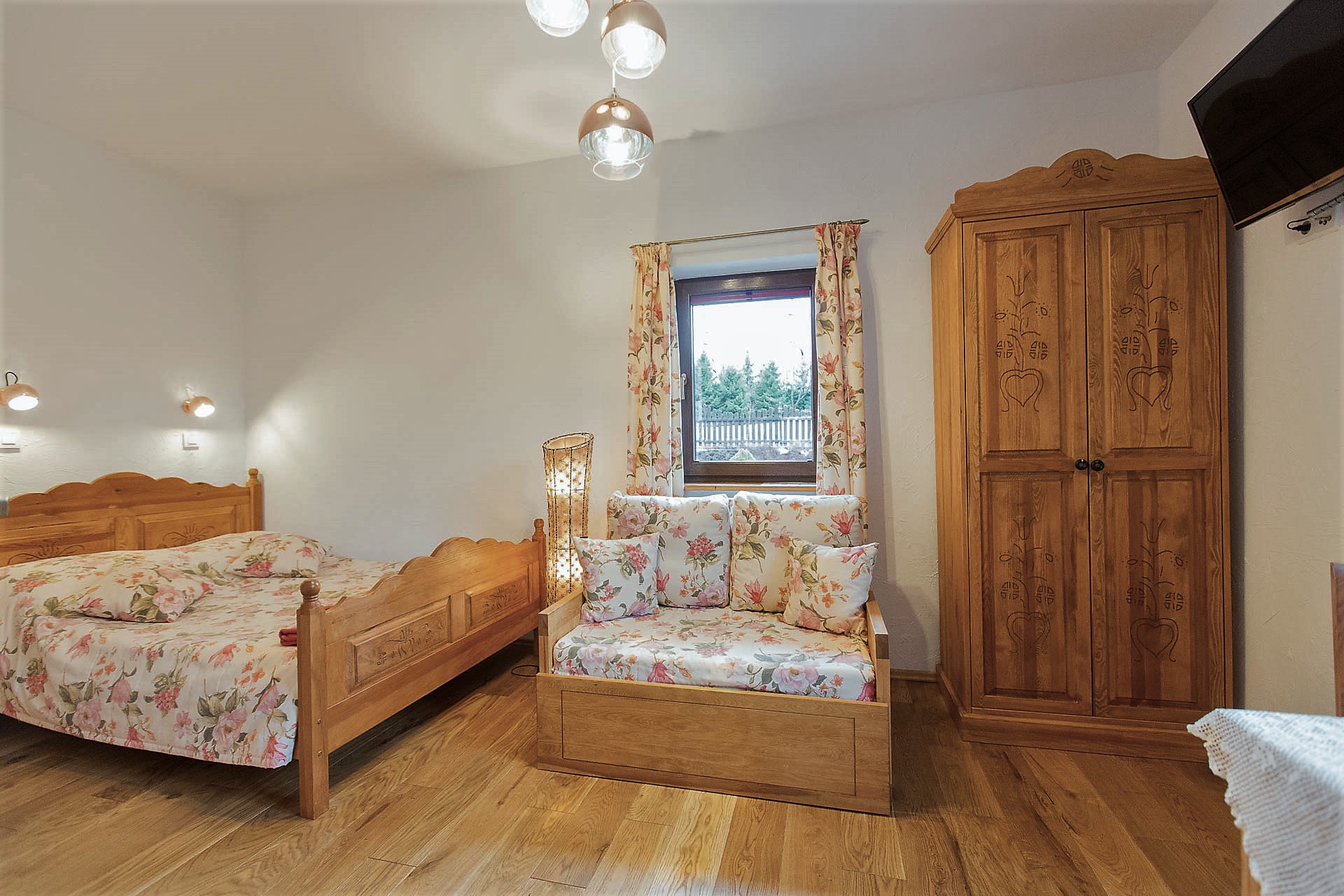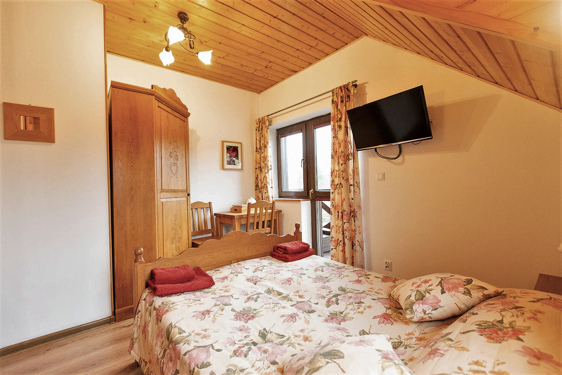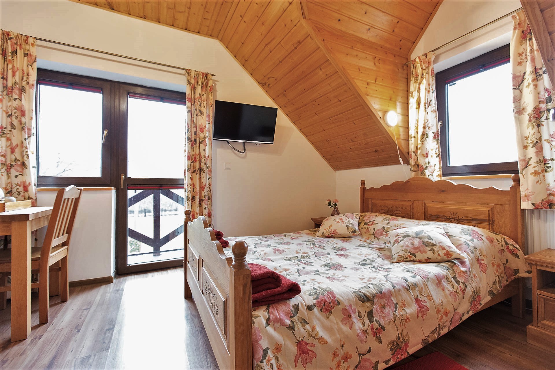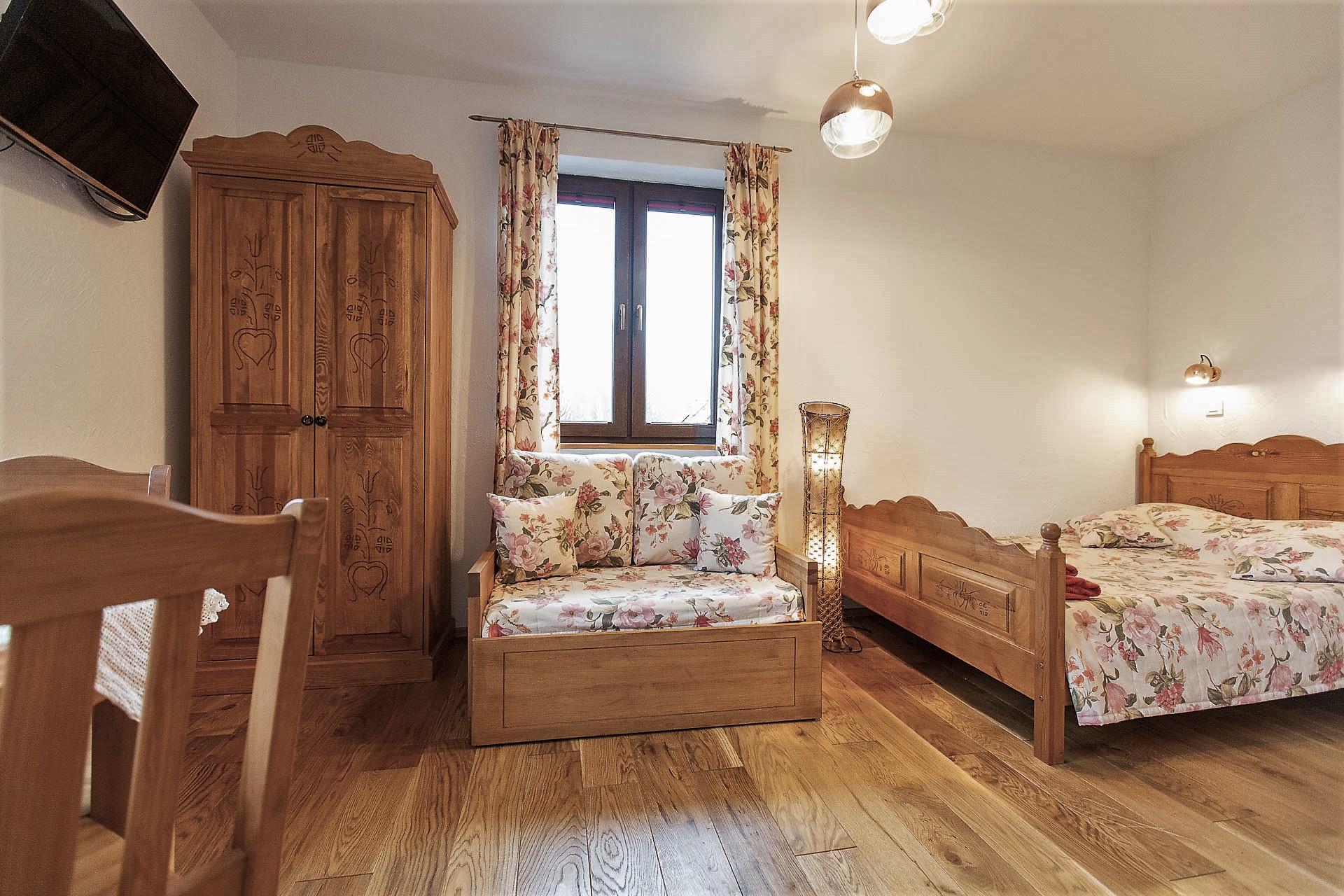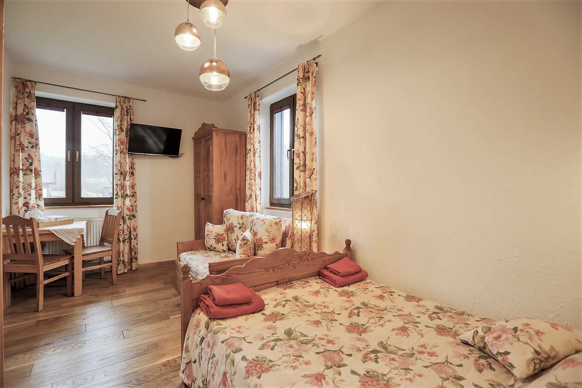 W Domu Gościnnym jednorazowo możemy gościć 20 osób w trzech segmentach z osobnymi wejściami. Proponujemy jeden pokój 1-osobowy, 2 pokoje 2-osobowe oraz 5 pokoi 3-osobowych z urokliwym widokiem na górski krajobraz. Istnieje możliwość wynajmu poszczególnych pokoi, segmentów lub całego Pensjonatu. Wszystkie pokoje posiadają łazienki, są wyposażone w telewizor z płaskim ekranem, czajnik elektryczny z zapasem kawy oraz herbaty.
