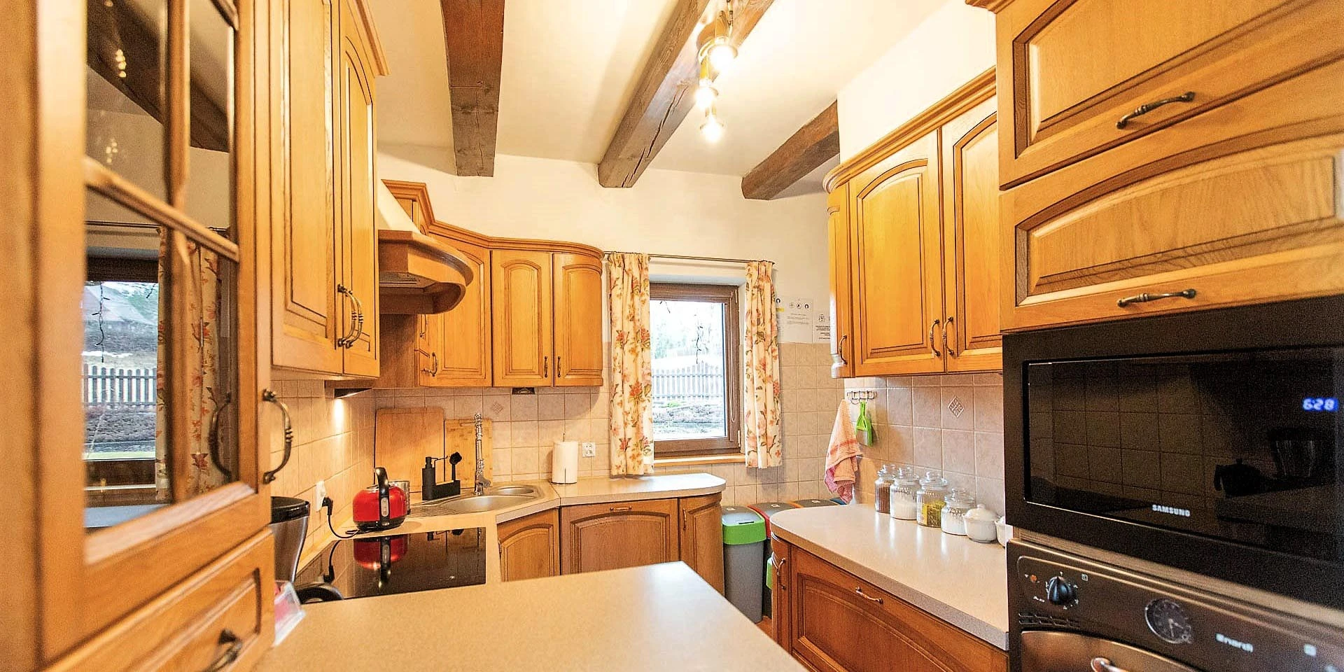 Kuchnia została dostosowana do potrzeb Gości Domu. Znajdą w niej Państwo lodówki dla Gości, płytę grzewczą, czajnik elektryczny, ekspres do kawy, komplet garnków oraz naczyń. A każdego, kto na urlopie chce odpocząć od gotowania, zachęcamy do wędrówek po szlakach kulinarnych i kosztowania regionalnych przysmaków.