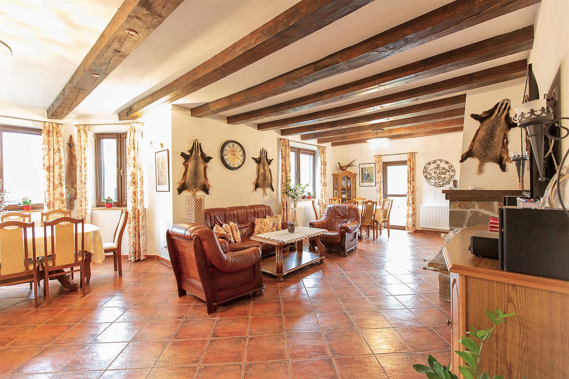 Na poszukujących odpoczynku po górskiej wycieczce czeka luksusowa wanna z hydromasażem. Kąpiel w blasku świec na pewno ukoi nerwy i pozwoli wypocząć zmęczonym mięśniom. Na parterze został zaaranżowany przestronny salon, połączony z doskonale wyposażoną kuchnią. Ciepła, przytulna atmosfera zaprasza do wspólnego relaksu przy kominku. Klimat, jaki oferuje Dom Gościnny Borsuczyna, sprzyja zarówno rodzinnym, jak i służbowym spotkaniom.