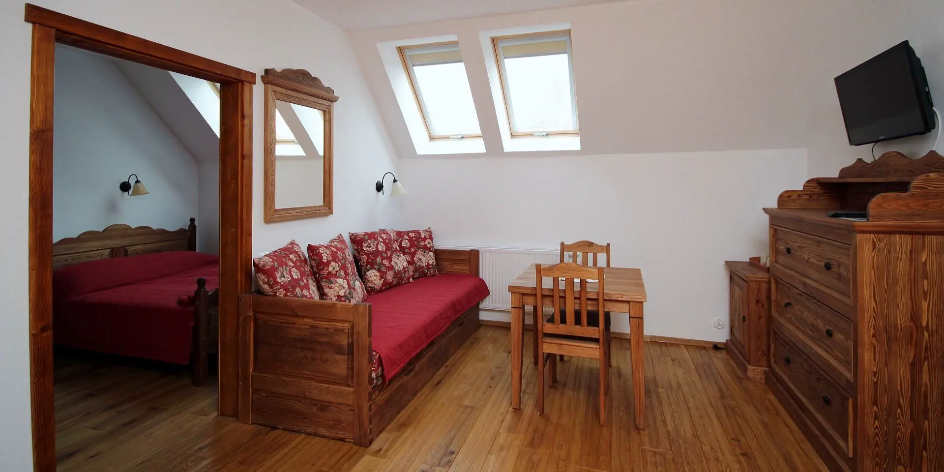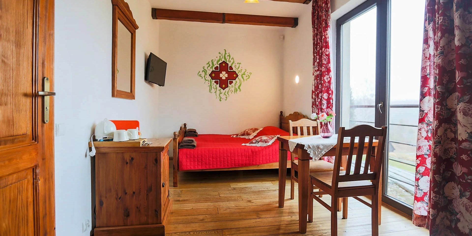 Pokoje w pensjonacie zostały urządzone w rustykalnym stylu inspirowanym regionalną historią oraz sztuką. Takie aranżacje sprawiają, że wnętrza są intrygujące i wprowadzają Gości w niepowtarzalny klimat przeszłości bieszczadzkiej krainy. Na parterze znajduje się komfortowy, przestronny salon z nastrojowym kominkiem, gdzie można urządzić kameralne spotkanie, szkolenie lub imprezę.
