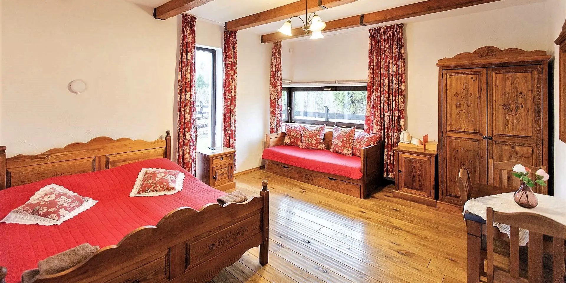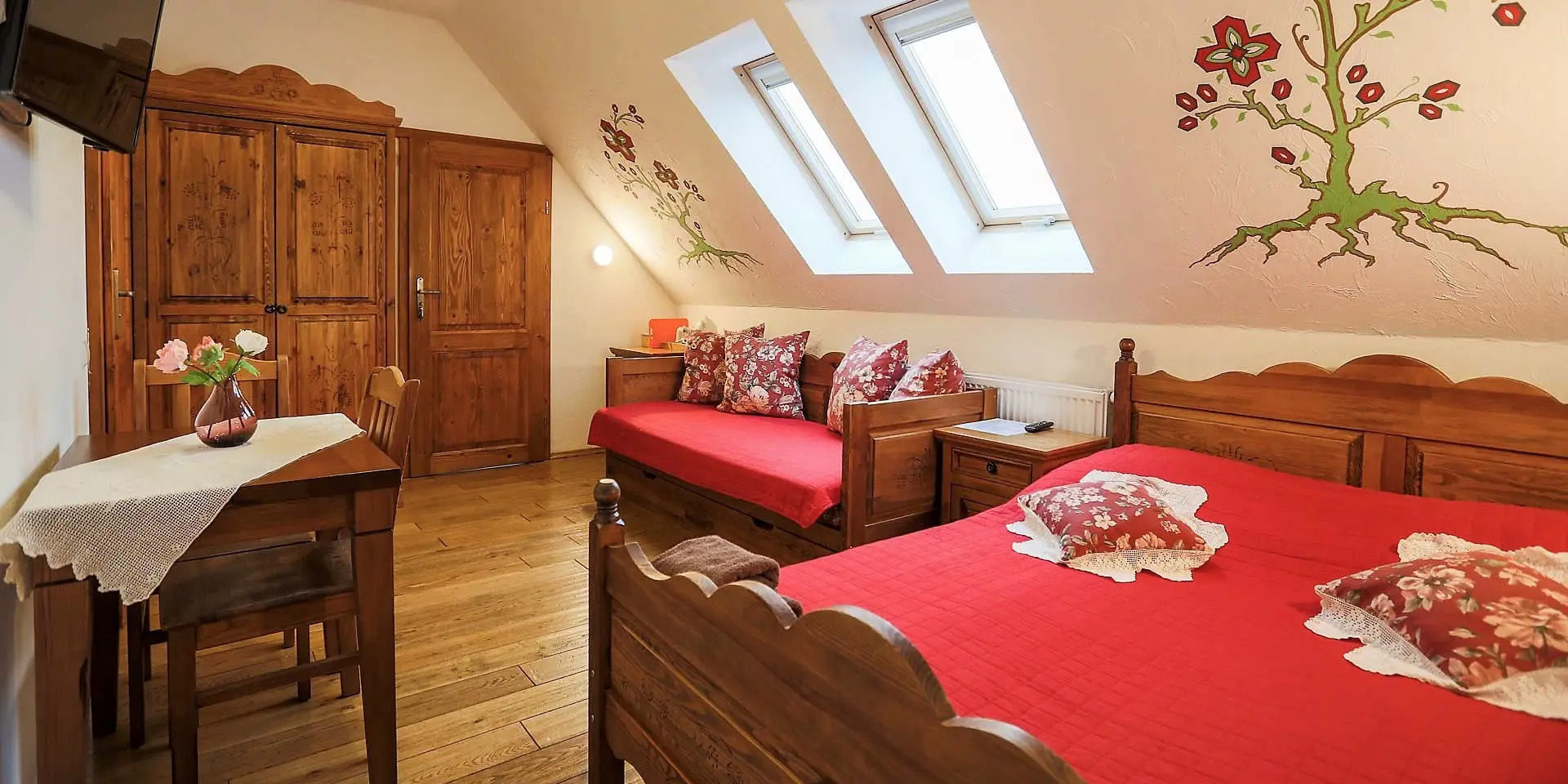 Zapewniamy gościnę dla 30 osób. Proponujemy trzy pokoje 2-osobowe, trzy pokoje 3-4-osobowe oraz dwa apartamenty 4-6-osobowe. Wszystkie mają osobne łazienki z kompletem ręczników i suszarką do włosów. Wyposażone są w telewizor, lodówkę na napoje oraz czajnik elektryczny wraz z zapasem kawy i herbaty.
